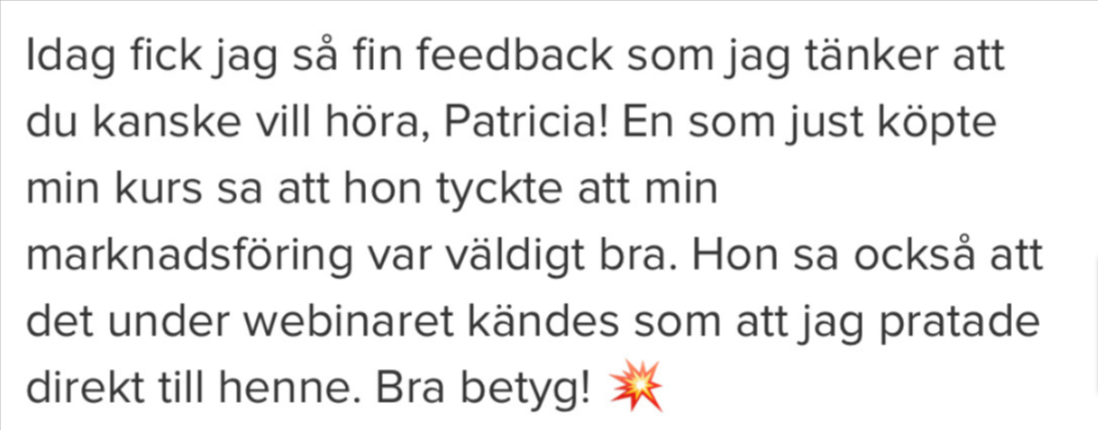 "Gör det bara. Ta inte alla andra som är billigare för de hjälper dig inte hela vägen. Det slutar ändå med att du måste ta Patricia några dyra år senare för du får ingen feedback från övriga kursledare på marknaden i Sverige. Jag vet för jag har provat."