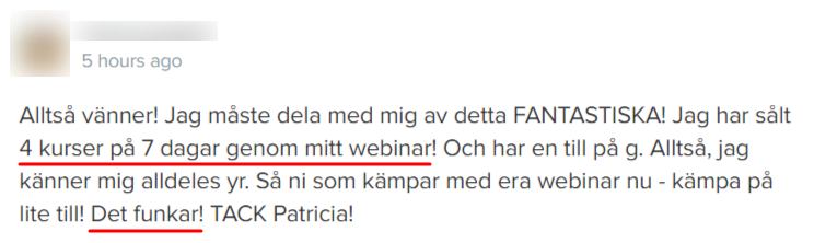 "Jag slösade bort mycket tid med att fundera på saken så jag uppmanar alla som verkligen vill lyckas med att ha en kurs online att jobba med Patricia.